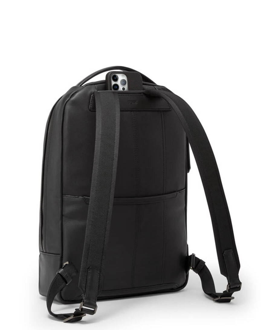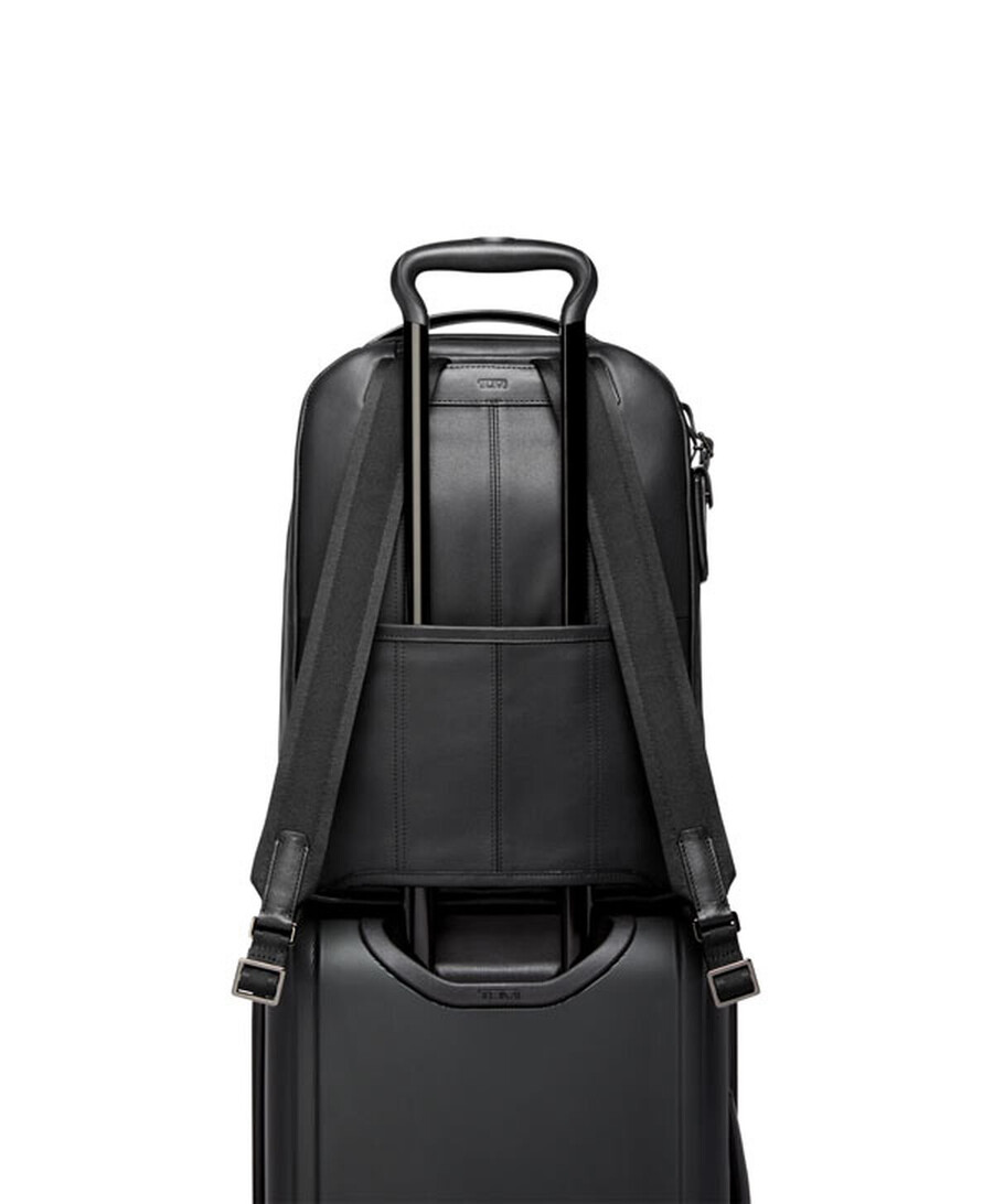 This refined backpack is suitable for work or the weekends. Toting an array of pockets inside and out, it has space for your laptop, documents, phone and more. Embossed leather accents frame the sleek silhouette.