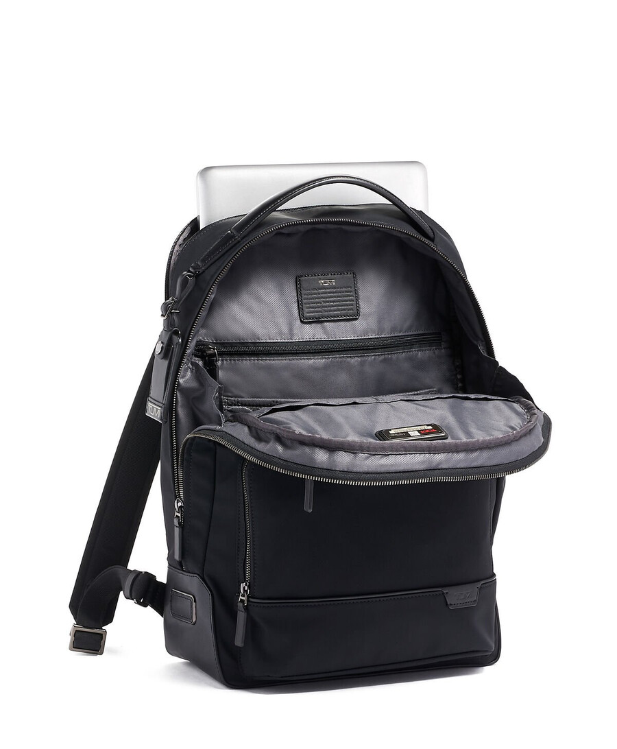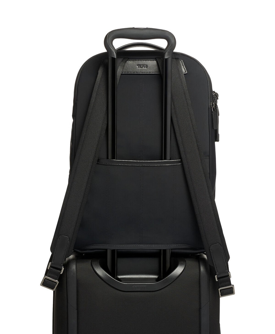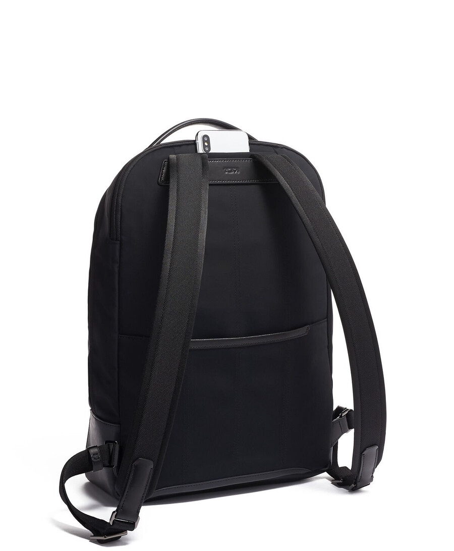- Leather-accented padded adjustable backpack straps