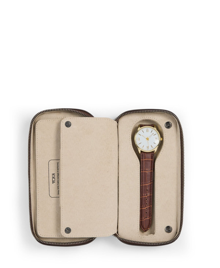 Keep your favorite watches safe and secure with this monogrammable leather case. It holds up to two watches and features a soft microfiber lining that snaps shut to protect your watches.*