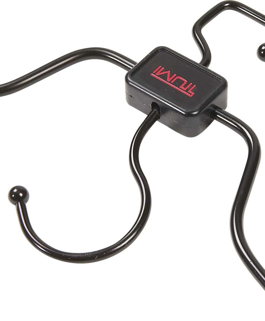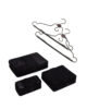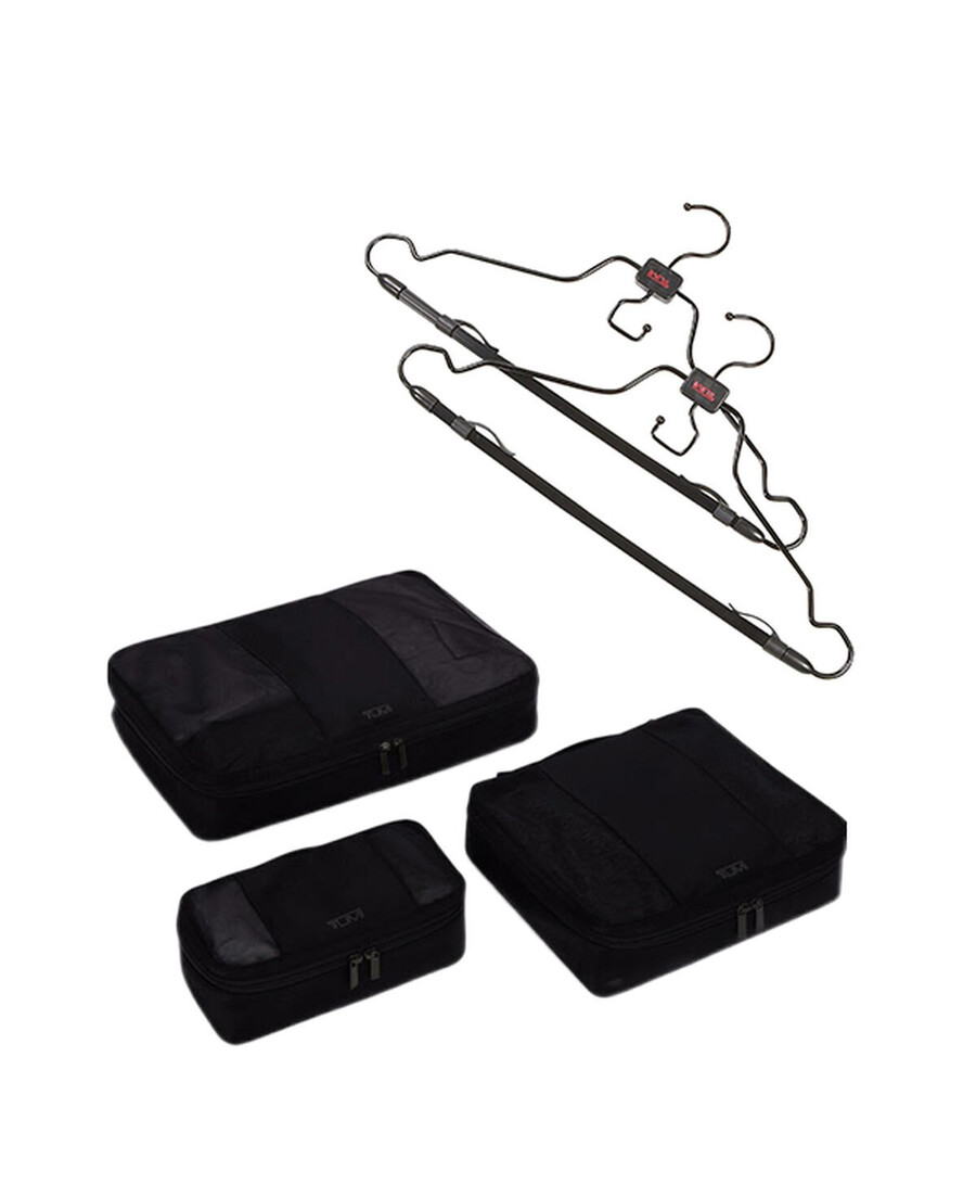 This set includes our engineered hangers (two) with both a rounded hook and a reversible square hook that snaps into the garment brackets. These durable hangers are designed to accommodate a suit jacket and pants; the bottom bar is ribbed and features clips to hold pants securely in place. For use in Tumi garment bags or wheeled cases with garment sleeves.
